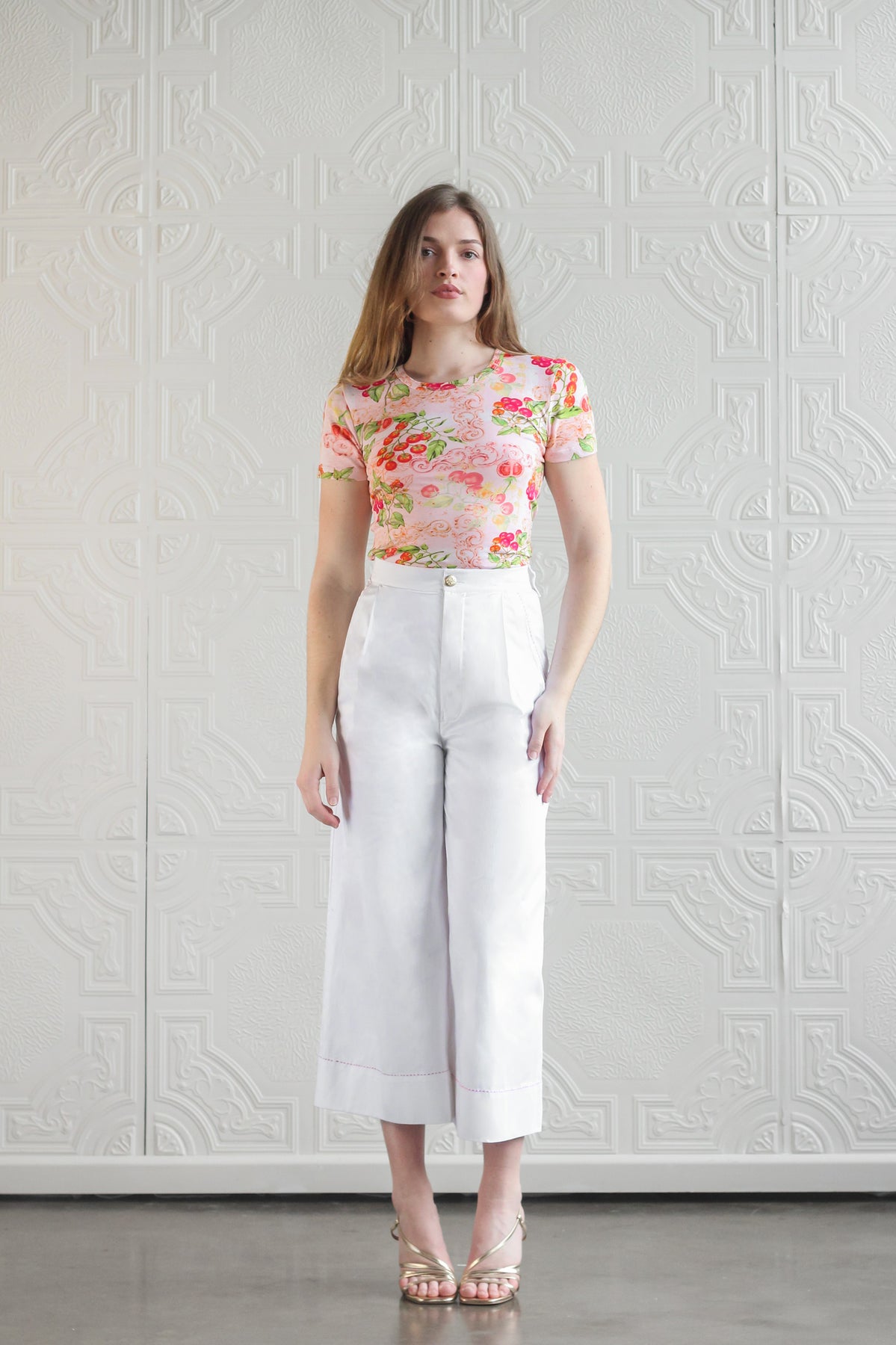 A joyful celebration of summer on the Italian coast, Sardinia Tomato Medley captures the vibrant spirit of Sardinia through a medley of sun-ripened tomatoes, leafy vines, and painterly scroll details scattered across a soft blush base. It is light, spirited and deliciously nostalgic, a wearable postcard from Sardinia inspired by food, travel, and la dolce vita.