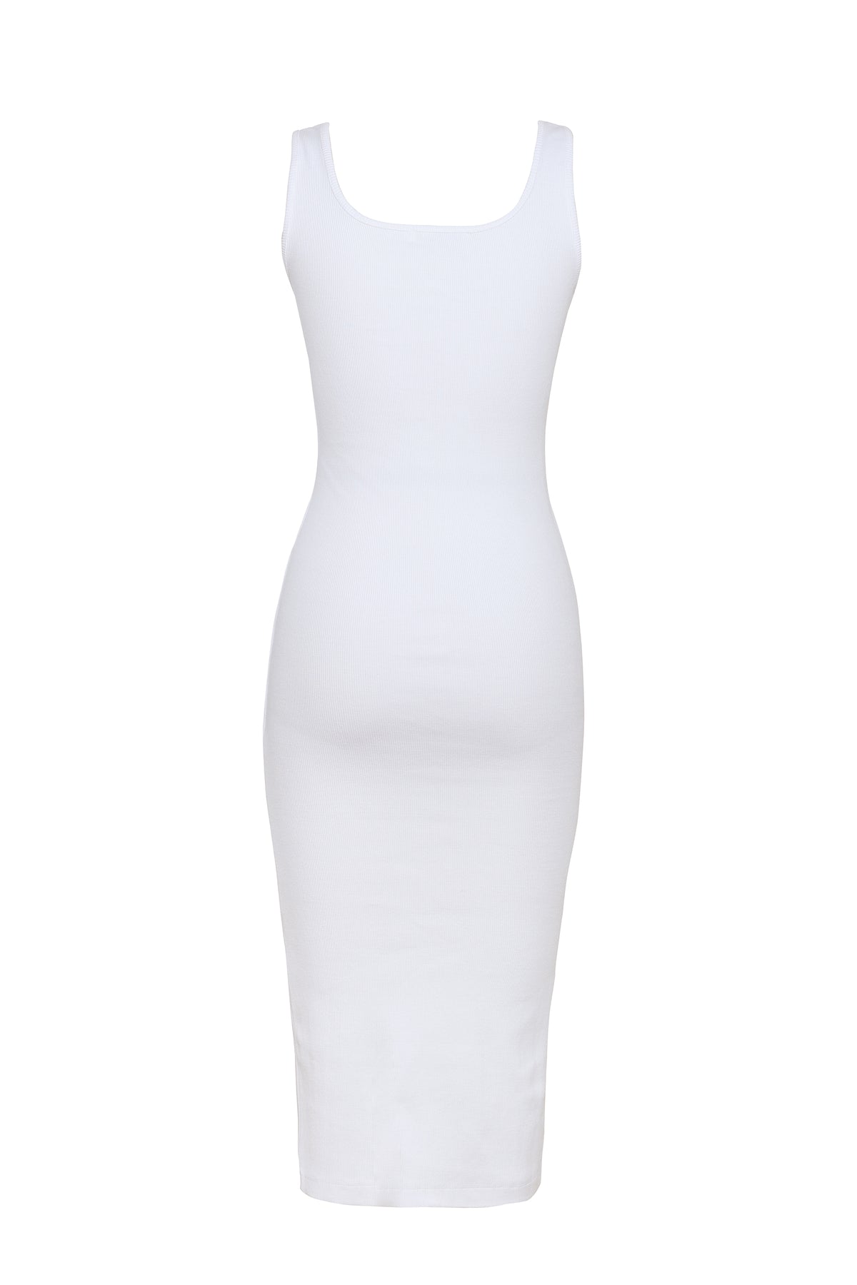 The Rib Dress in White is all about sleek simplicity with a body-skimming fit that does the talking. Cut in a midi length with a square neckline and wide straps, it frames the shoulders beautifully while contouring through the waist and hips. The ribbed knit adds subtle texture and stretch, hugging in all the right places without feeling restrictive. Effortless and versatile, it’s the kind of piece you can slip on with sandals for day or elevate with heels for a streamlined, after-dark look.