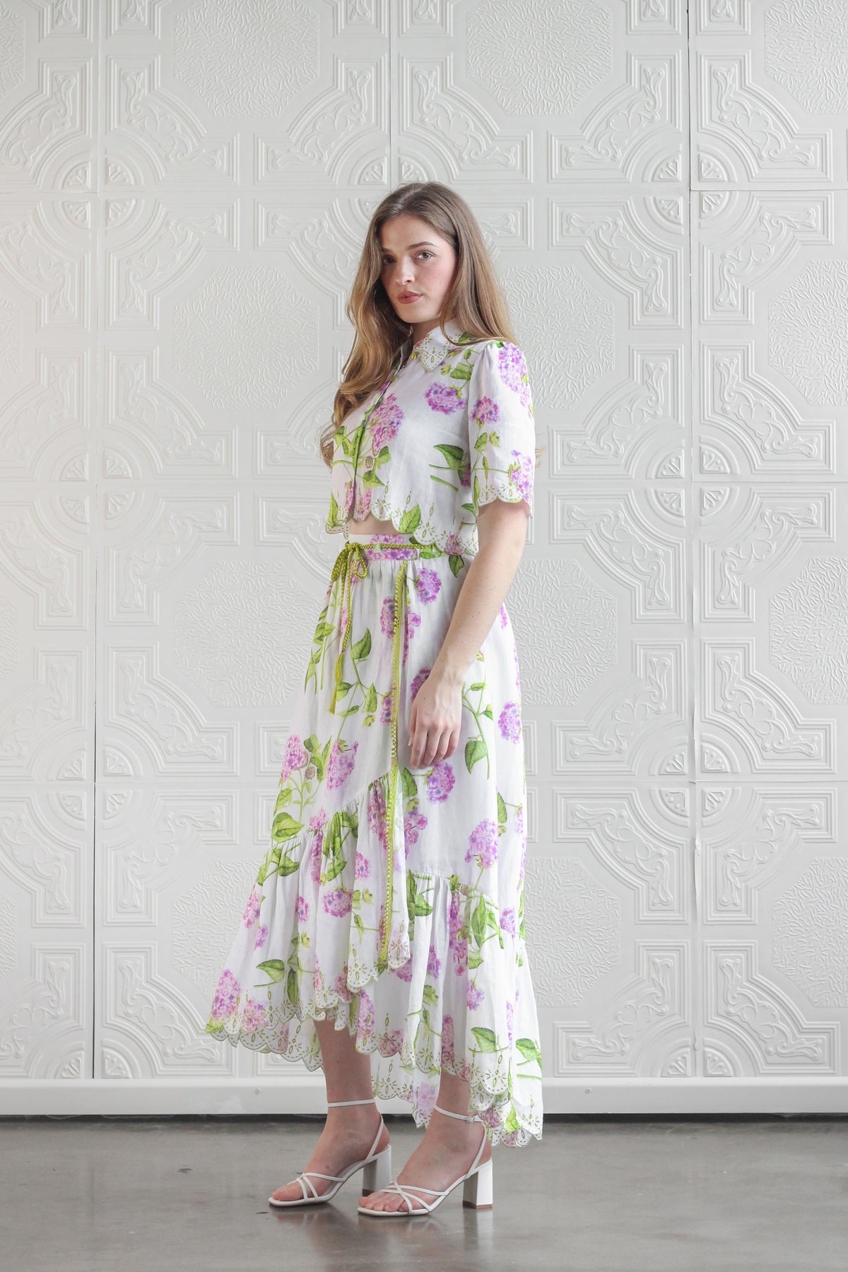 Meet the Embroidered Crop Shirt in Lilac Flora, a cropped button-up shirt with a softly structured silhouette, finished with a scalloped hem, embroidered edging, and a playful statement collar. Easy to wear but hard to ignore, this is the kind of shirt that makes even a simple outfit feel intentional. Pair it with the Banded Wrap Skirt as a set or style it with your favourite jeans.