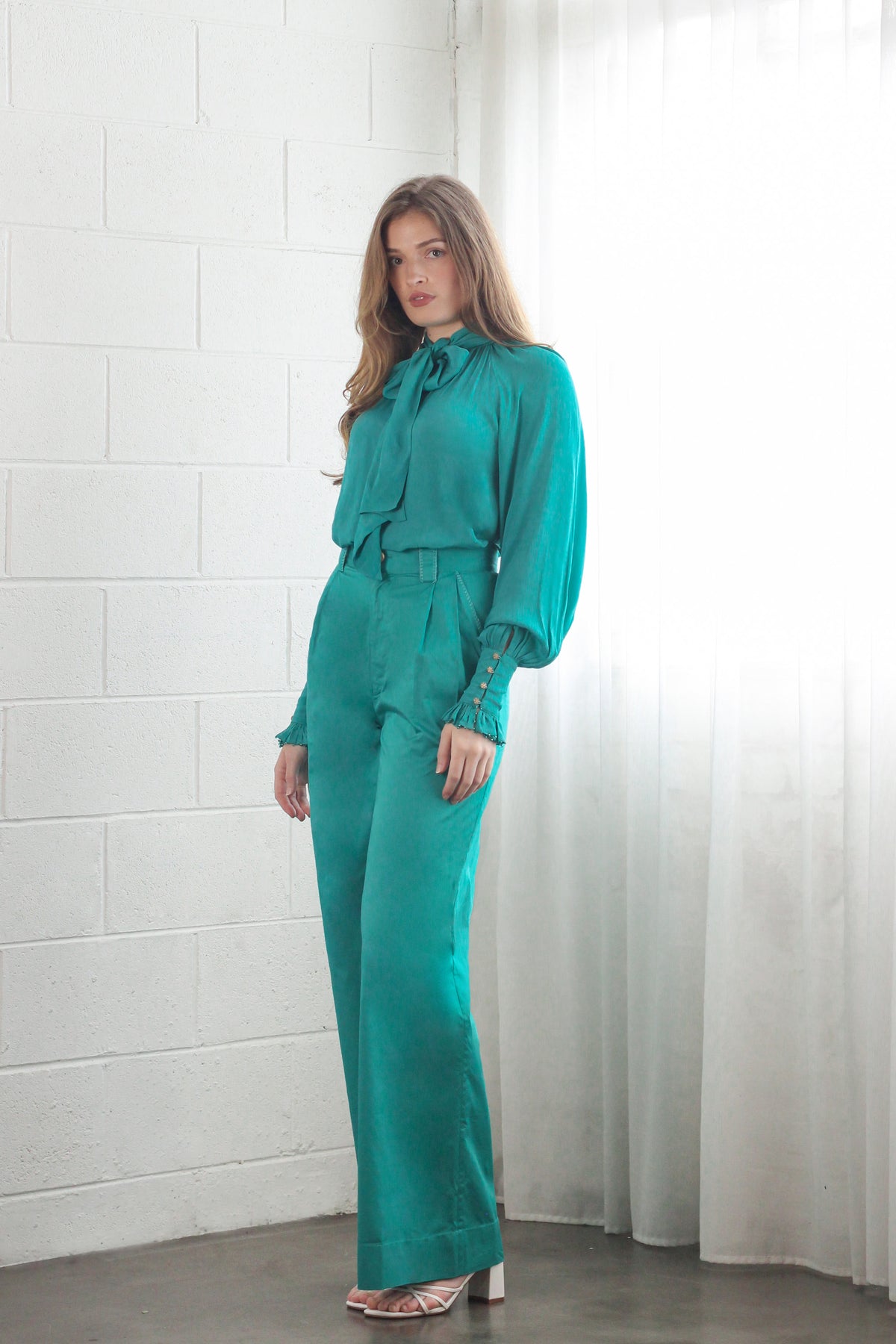 Introducing the Pleated Trouser in Turquoise, featuring elegant pleats that flow from a high waist. Made from soft cotton satin, it offers a fit-and-flare shape that enhances your silhouette. Perfectly paired with the Sleeveless Blazer in the same colour.