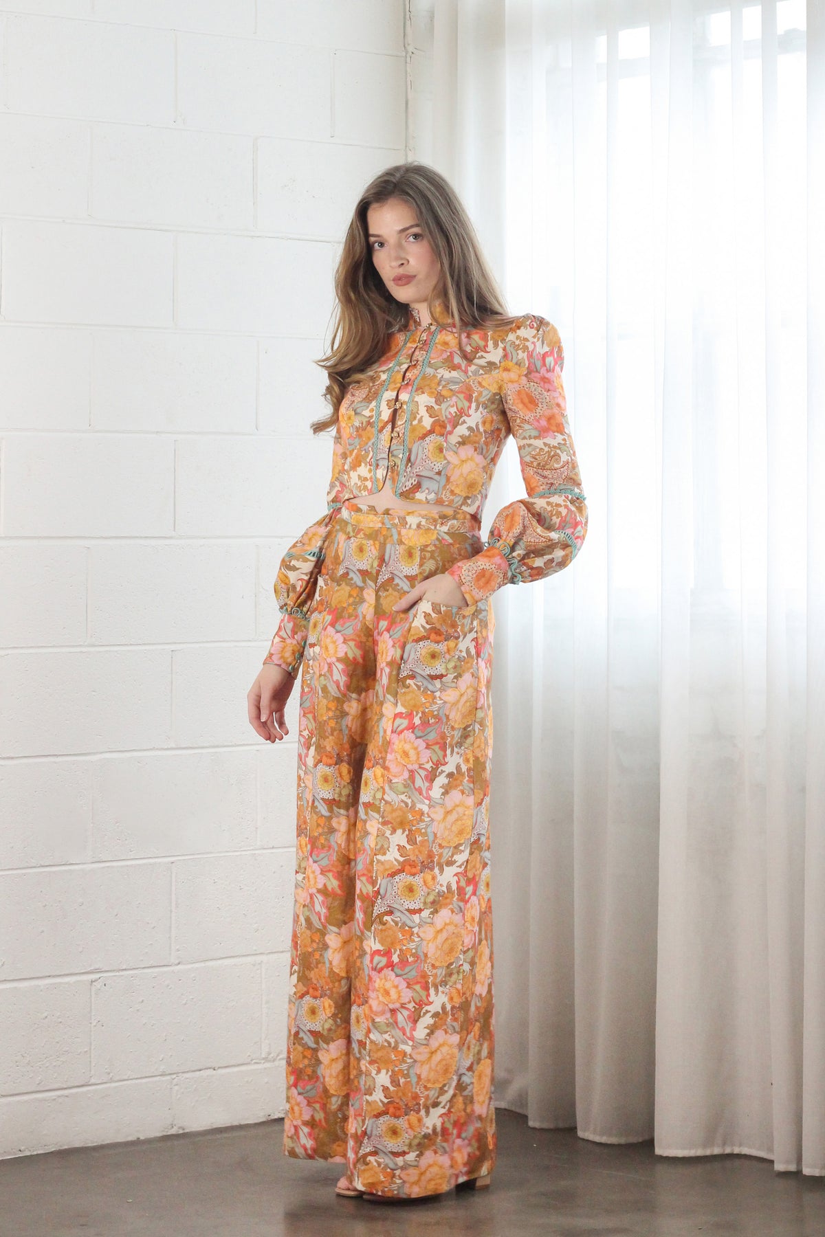 Introducing our Wide Leg Bolero Pants in Champagne Picnic. Featuring subtle V cut-out at the waist, these high-waisted pants cascading gracefully into a wide hemline. Versatile to style with any solid colour top, or pair with the Cropped Balloon Sleeve Jacket in the same print.